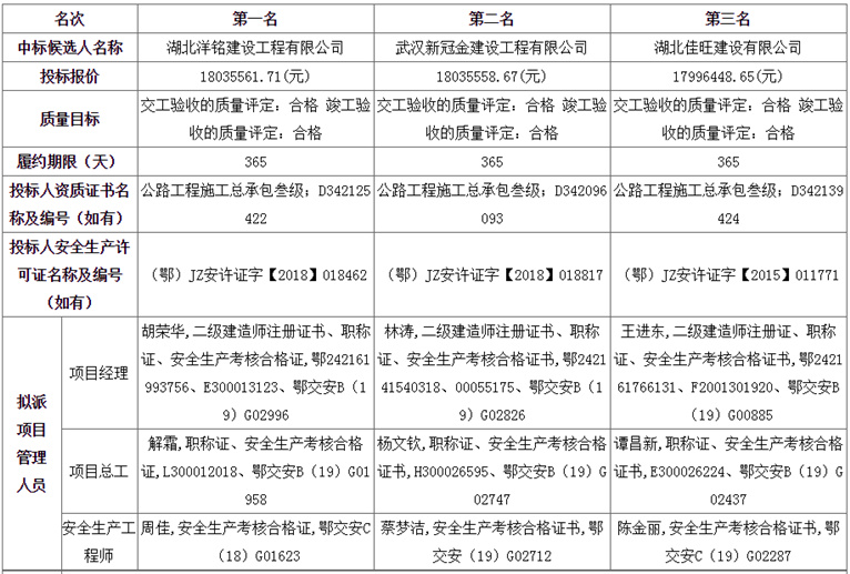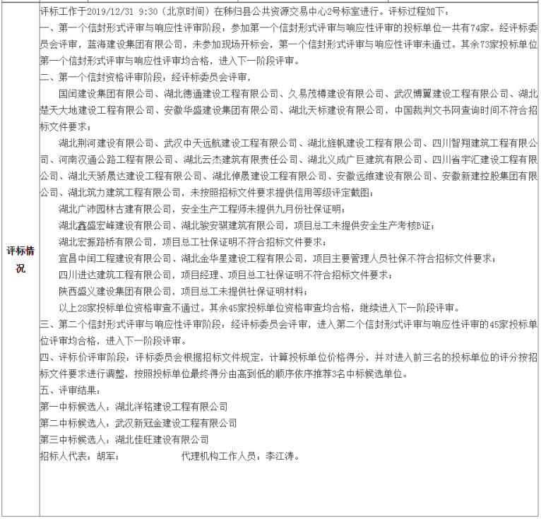標段(包)編號:ZGGJT0098-201901-01 一、招標概況 秭歸縣X210歸州大橋至沿水河段公路工程(水田壩段)于2019年12月11日在秭歸縣公共資源交易信息網發布招標公告,2019年12月31日9時0分在秭歸縣公共資源交易中心開標、評標 ,根據評標委員會提交的評標報告,現將中標候選人公示如下: 二、評標結果